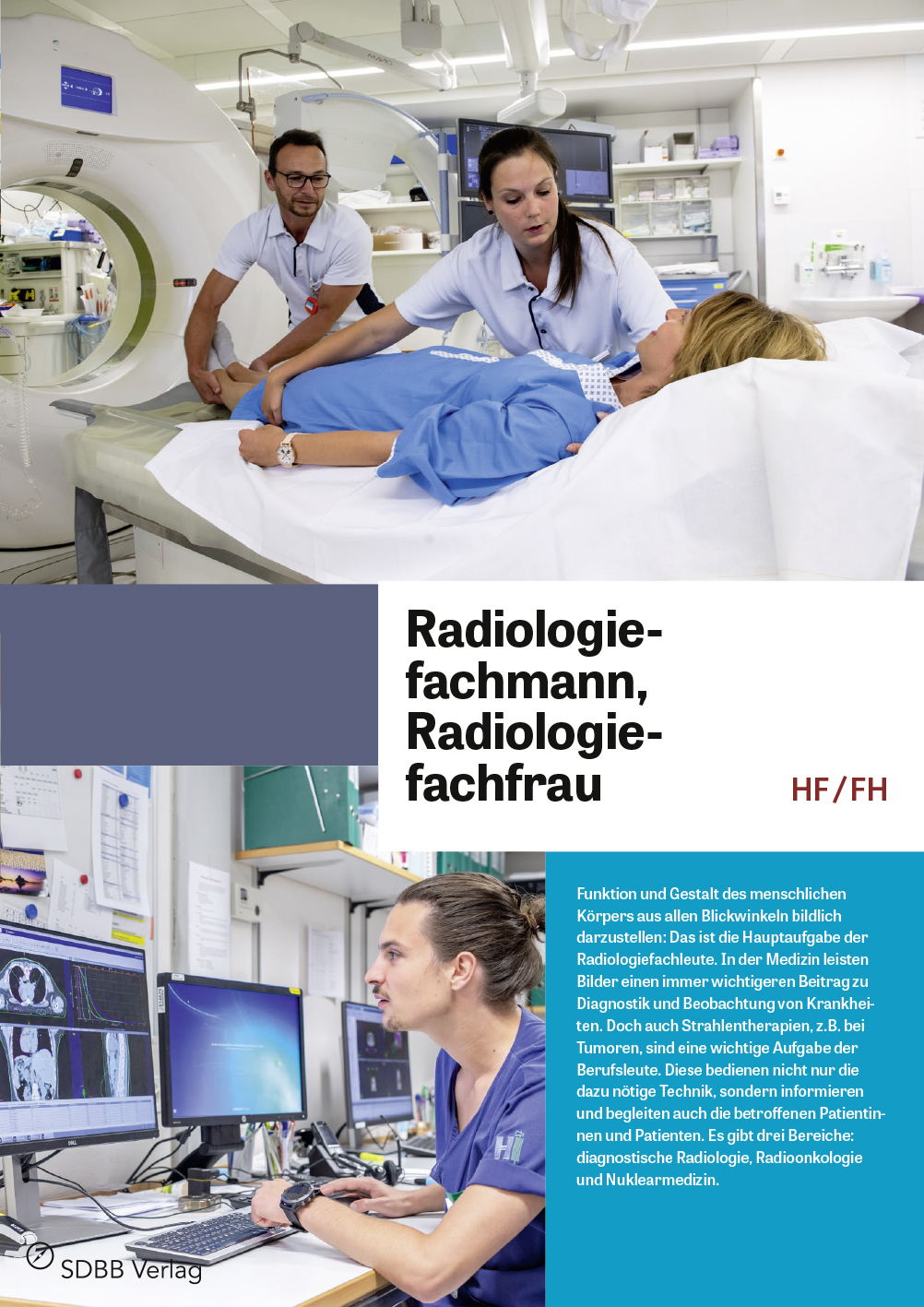 In Bild und Text wird der Arbeitsalltag illustriert und über die Anforderungen, die Entwicklungsmöglichkeiten, die Situation auf dem Arbeitsmarkt und die Inhalte der Ausbildung von Radiologiefachleuten informiert.