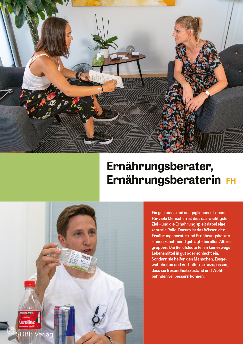 Im Faltblatt zeigt ein junger Ernährungsberater seine Arbeit in einem Spital. Dort berät er adipöse Patienten, aber auch solche mit Diabetes Typ 2. Eine Ernährungsberaterin nimmt in ihrer Praxis für Ernährung und Bewegung Patientinnen und Patienten aller Altersgruppen in Empfang. In Interviews erzählen eine Ernährungsberaterin in einer Spitex-Organisation, spezialisiert auf klinische Ernährung, sowie eine Berufsfrau in der öffentlichen Gesundheitsförderung von ihren Tätigkeiten.