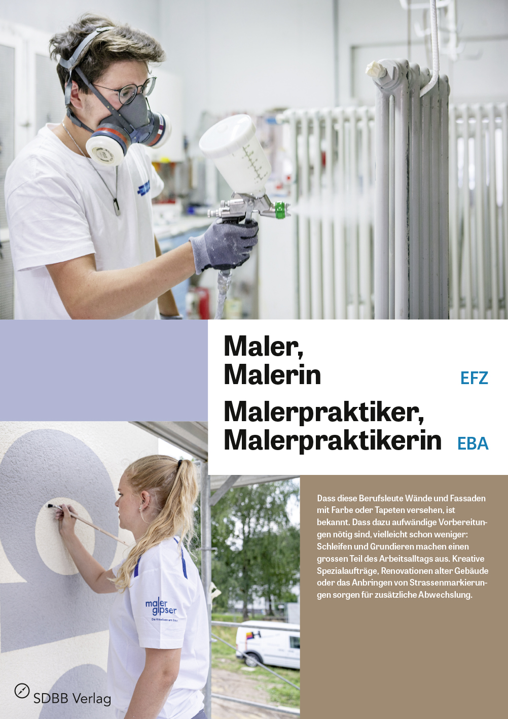 Das Faltblatt illustriert in Bild und Text den Arbeitsalltag, die Anforderungen und die Entwicklungsmöglichkeiten von Malerinnen und Malern, Malerpraktikerinnen und Malerpraktikern. Selbstverständlich klärt das Faltblatt auch über die Situation auf dem Arbeitsmarkt, die Anforderungen und die Inhalte der beruflichen Grundbildung auf.