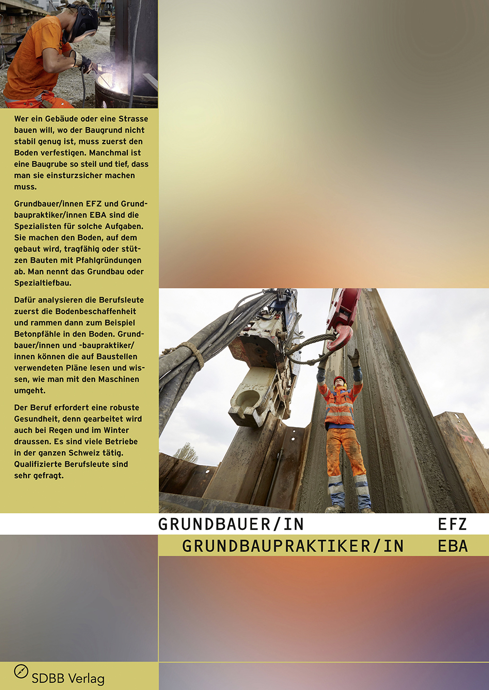 Das Faltblatt porträtiert drei junge Berufsleute: Ein angehender Grundbauer bohrt lange Stahlträger in den Boden, damit anschliessend eine Unterführung gebaut werden kann. Ein junger Berufsmann bohrt bei strömendem Regen lange Löcher in die Grubenwand um den Hang zu sichern. Ein lernender Grundbaupraktiker möchte nach der Berufslehre als Maschinenführer einsteigen. Das Faltblatt illustriert in Bild und Text den Arbeitsalltag, die Anforderungen, Den Arbeitsmarkt sowie die Entwicklungsmöglichkeiten der Berufsleute. Drei Laufbahnporträts zeigen mögliche Weiterentwicklungen in diesem Beruf auf.