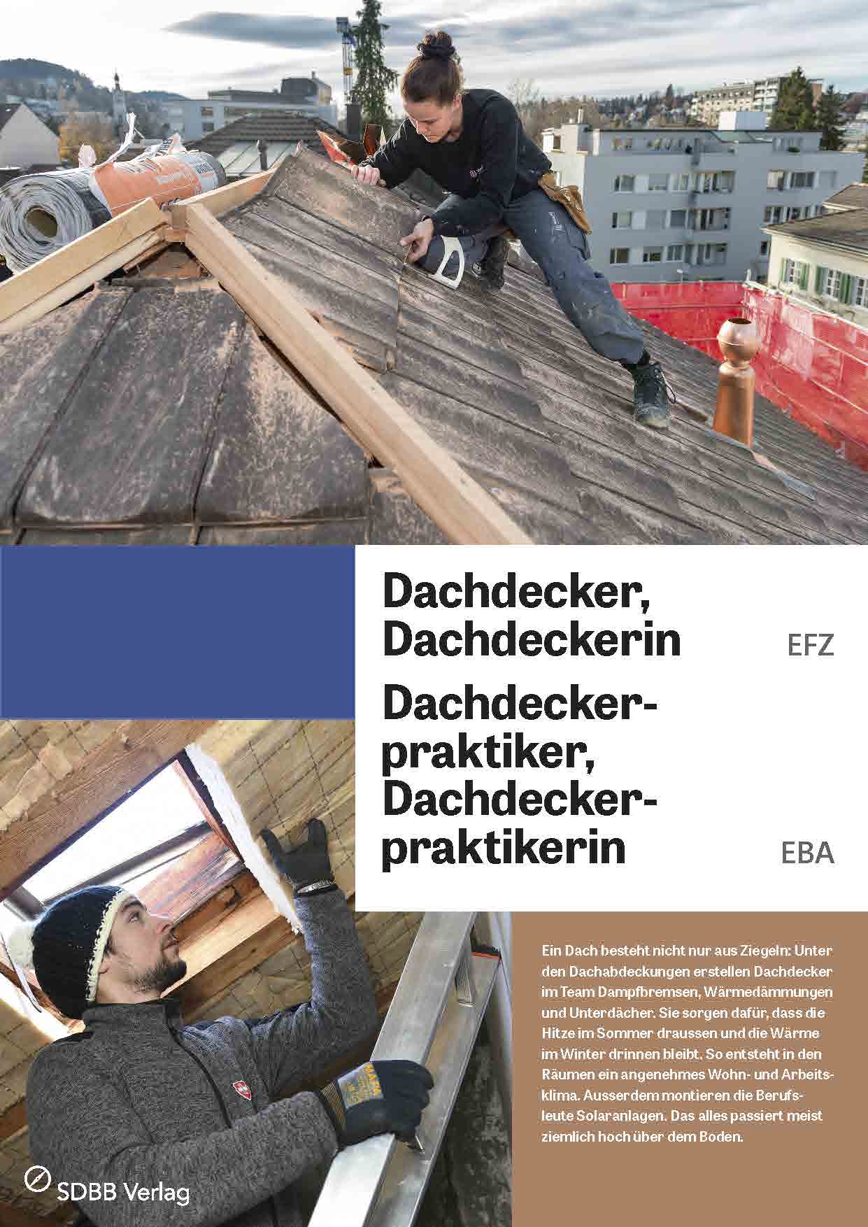 Im Faltblatt zeigen drei junge Berufsleute ihren Alltag: Eine Dachdeckerin arbeitet bei einem grösseren Betrieb und schätzt die Zusammenarbeit mit vielen verschiedenen Berufsleuten. Ein lernender Dachdecker arbeitet oft an Sanierungen, die Gebäude energieeffizienter machen. Und ein lernender Dachdeckerpraktiker erklärt die vielen verschiedenen Arbeitsschritte in seinem Beruf.