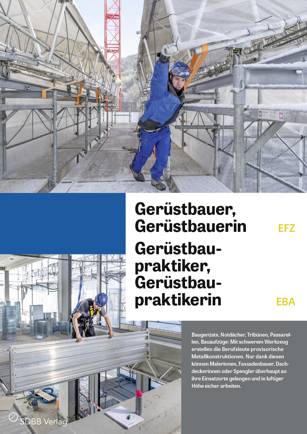 Das Faltblatt porträtiert drei junge Berufsleute: Ein lernender Gerüstbauer sichert den Neubau eines Mehrfamilienhauses. Ein Gerüstbauer baut waghalsige Konstruktionen an einem Firmenneubau. Und ein Gerüstbaupraktiker trotzt der eisigen Kälte, während er an einem Wohnblock arbeitet.