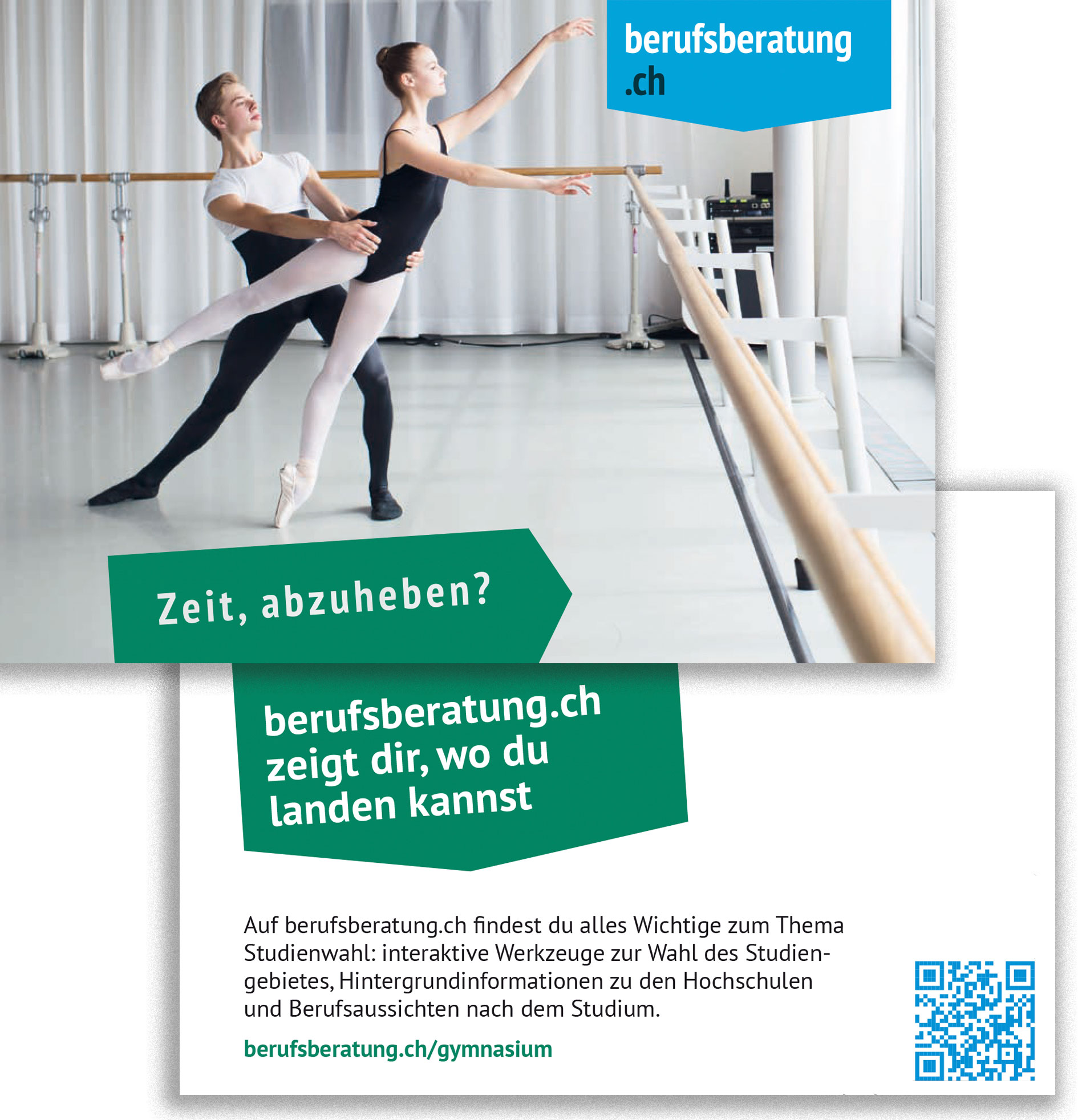 Der Flyer im Postkartenformat richten sich an Gymnasiastinnen und Gymnasiasten im Studienwahlprozess, die sich auf dem Portal www.berufsberatung.ch informieren wollen und macht mit der Angabe von Shortlinks auf die wichtigsten Inhalte aufmerksam.