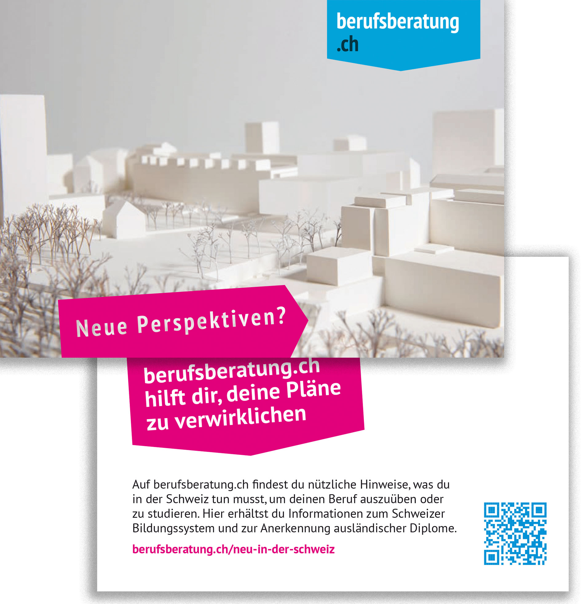 Der Flyer im Postkartenformat richten sich alle, die neu in der Schweiz sind und hier arbeiten oder sich ausbilden lassen möchten. Er macht auf das Portal www.berufsberatung.ch und mit der Angabe von Shortlinks auf die wichtigsten Inhalte aufmerksam.