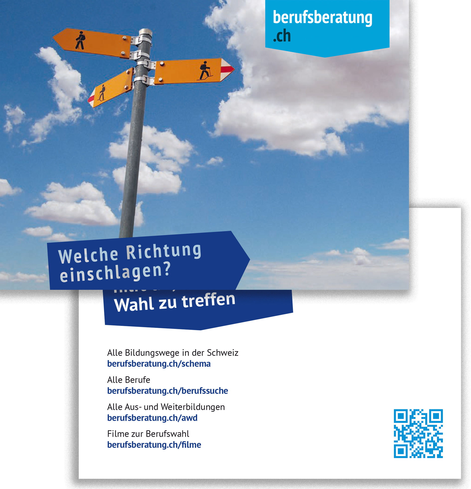 Der Flyer im Postkartenformat richten sich an alle, die sich auf dem Portal www.berufsberatung.ch informieren wollen und macht mit der Angabe von Shortlinks auf die wichtigsten Inhalte aufmerksam.
