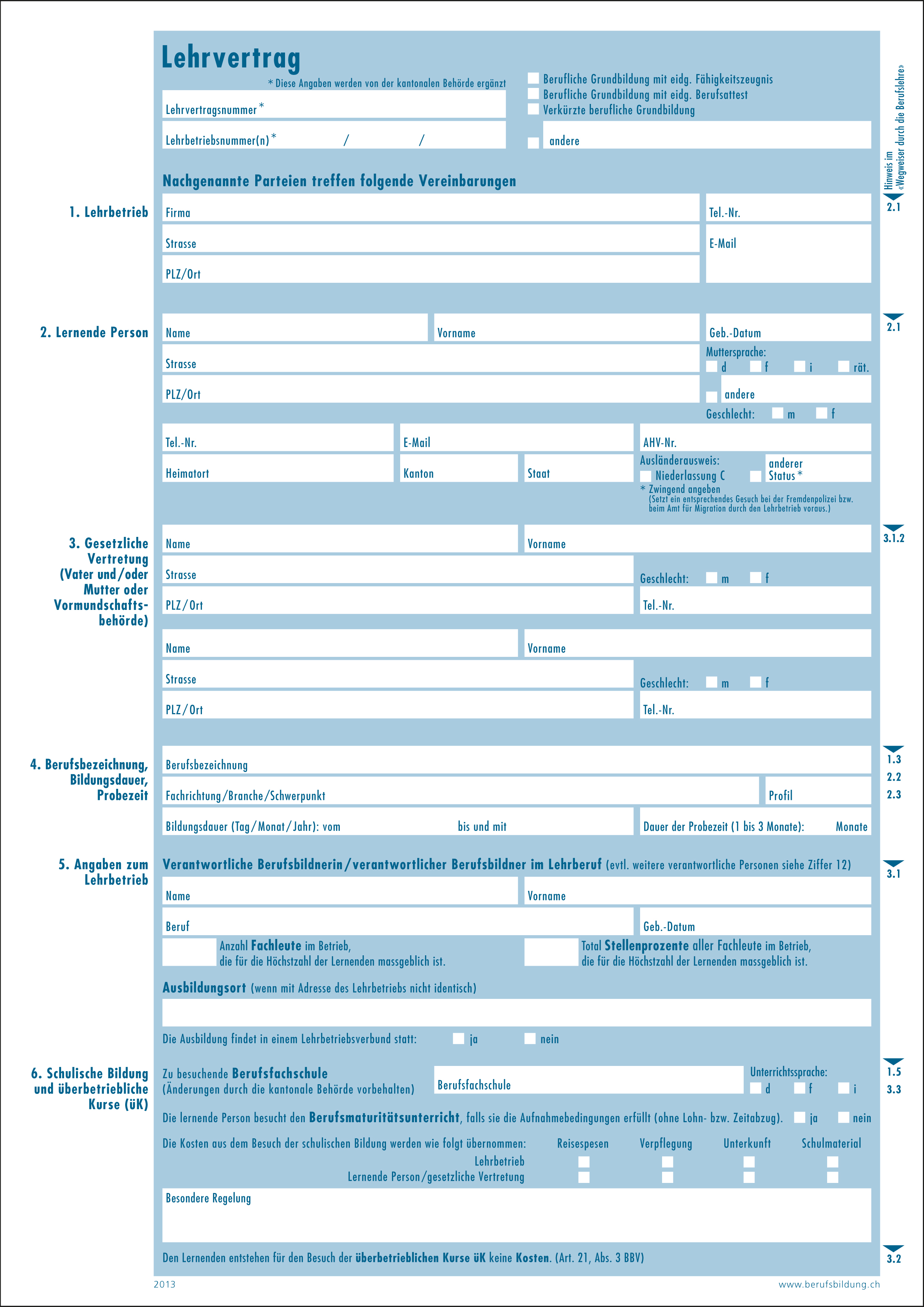 Das offizielle, national gültige Lehrvertragsformular steht in allen vier Landessprachen und in verschiedenen Formaten zur Verfügung. Dieser einheitliche Lehrvertrag gilt für alle drei- oder vierjährigen Grundbildungen, die mit einem eidg. Fähigkeitszeugnis und alle zweijährigen Grundbildungen, die mit eidg. Berufsattest abschliessen.