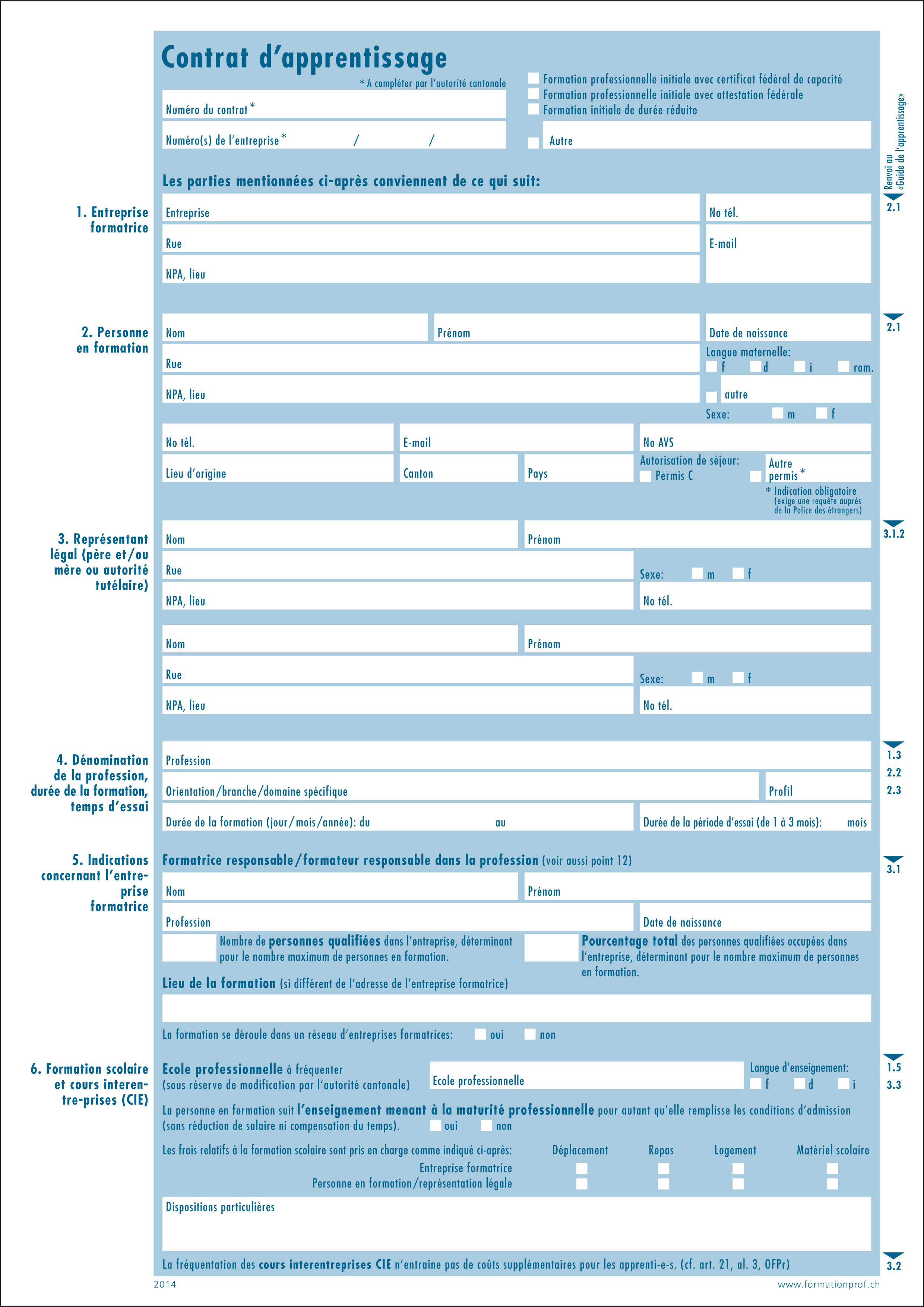 Le formulaire contrat d’apprentissage s’applique dans toute la Suisse; il est disponible dans les quatre langues nationales et en différents formats. Ce contrat d’apprentissage standard s’utilise pour toutes les formations initiales, d’une part celles de trois ou quatre ans qui débouchent sur un certificat fédéral de capacité, d’autre part celles de deux ans, qui débouchent sur une attestation fédérale de formation professionnelle.