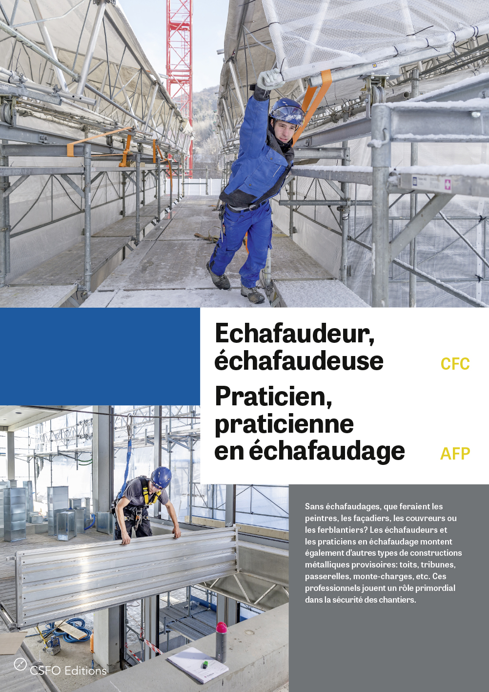 Sans échafaudages, que feraient les peintres, les façadiers, les couvreurs ou les ferblantiers? Les échafaudeurs et les praticiens en échafaudage montent également d'autres types de constructions métalliques provisoires: toits, tribunes, passerelles, monte-charges, etc. Ces professionnels jouent un rôle primordial dans la sécurité des chantiers.