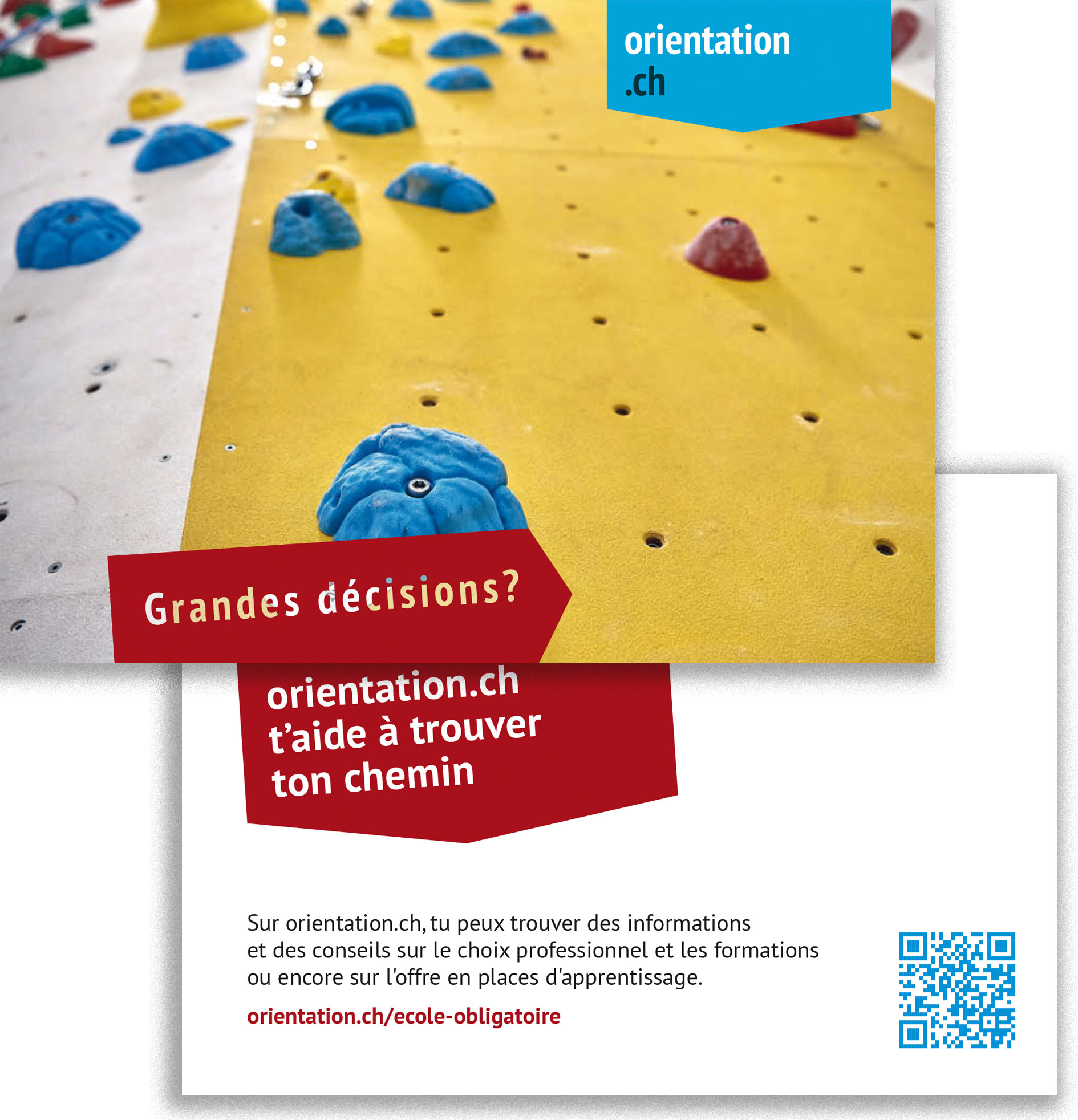 Ce flyer explique comment trouver, par le biais du portail orientation.ch, des informations et des conseils sur le choix professionnel et les formations ou encore sur l’offre de places d’apprentissage.