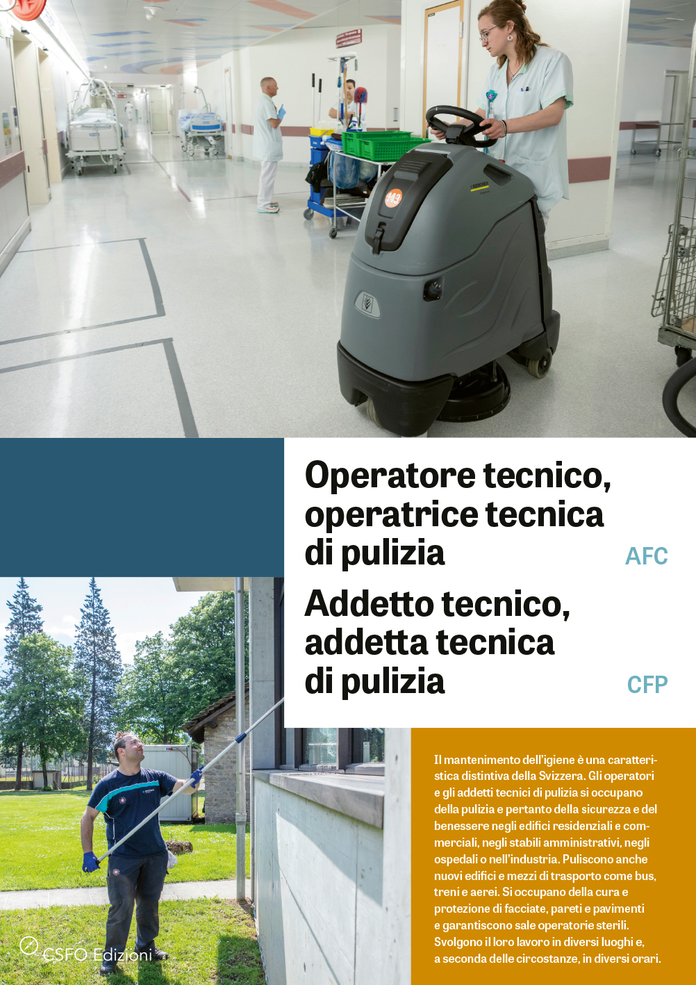 Il mantenimento dell’igiene è una caratteristica distintiva della Svizzera. Gli operatori e gli addetti tecnici di pulizia si occupano della pulizia e pertanto della sicurezza e del benessere negli edifici residenziali e commerciali, negli stabili amministrativi, negli ospedali o nell’industria. Puliscono anche nuovi edifici e mezzi di trasporto come bus, treni e aerei. Si occupano della cura e protezione di facciate, pareti e pavimenti e garantiscono sale operatorie sterili. Svolgono il loro lavoro in diversi luoghi e, a seconda delle circostanze, in diversi orari.