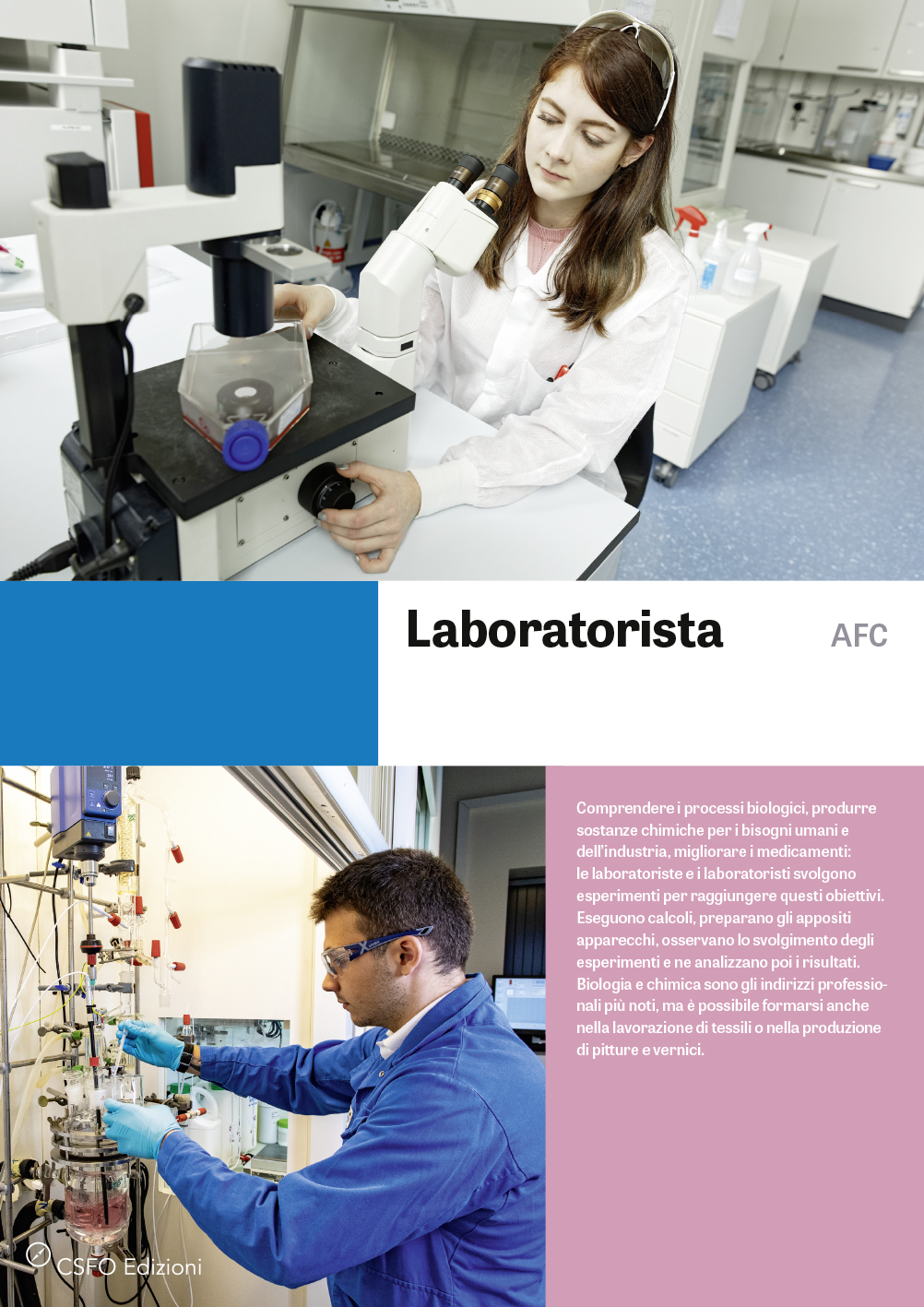 Comprendere i processi biologici, produrre sostanze chimiche per i bisogni umani e dell'industria, migliorare i medicamenti: le laboratoriste e i laboratoristi svolgono esperimenti per raggiungere questi obiettivi. Eseguono calcoli, preparano gli appositi apparecchi, osservano lo svolgimento degli esperimenti e ne analizzano poi i risultati. Biologia e chimica sono gli indirizzi professionali più noti, ma è possibile formarsi anche nella lavorazione di tessili o nella produzione di pitture e vernici.