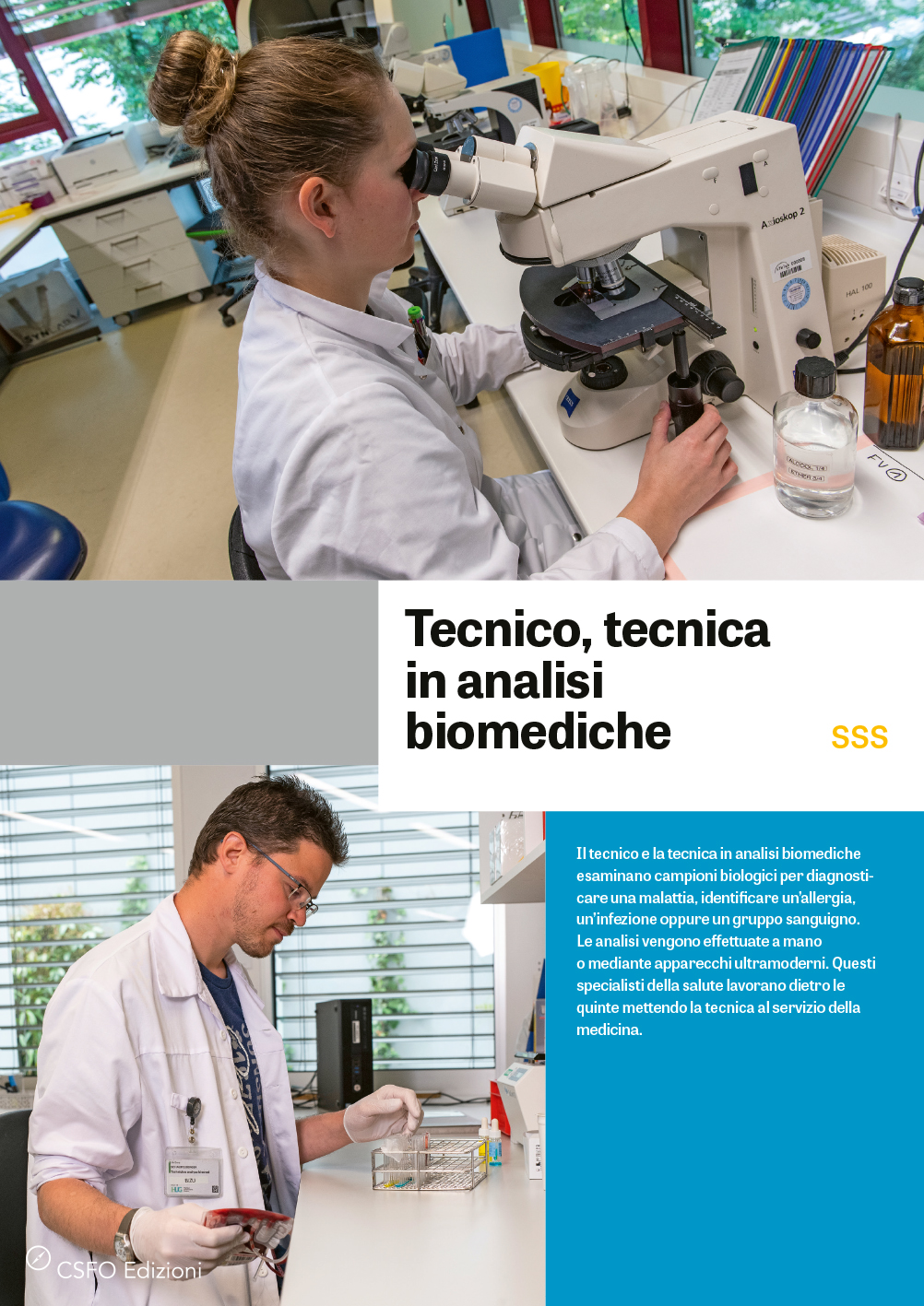 Il tecnico e la tecnica in analisi biomediche esaminano campioni biologici per diagnosticare una malattia, identificare un'allergia, un'infezione oppure un gruppo sanguigno. Le analisi vengono effettuate a mano o mediante apparecchi ultramoderni. Questi specialisti della salute lavorano dietro le quinte mettendo la tecnica al servizio della medicina.