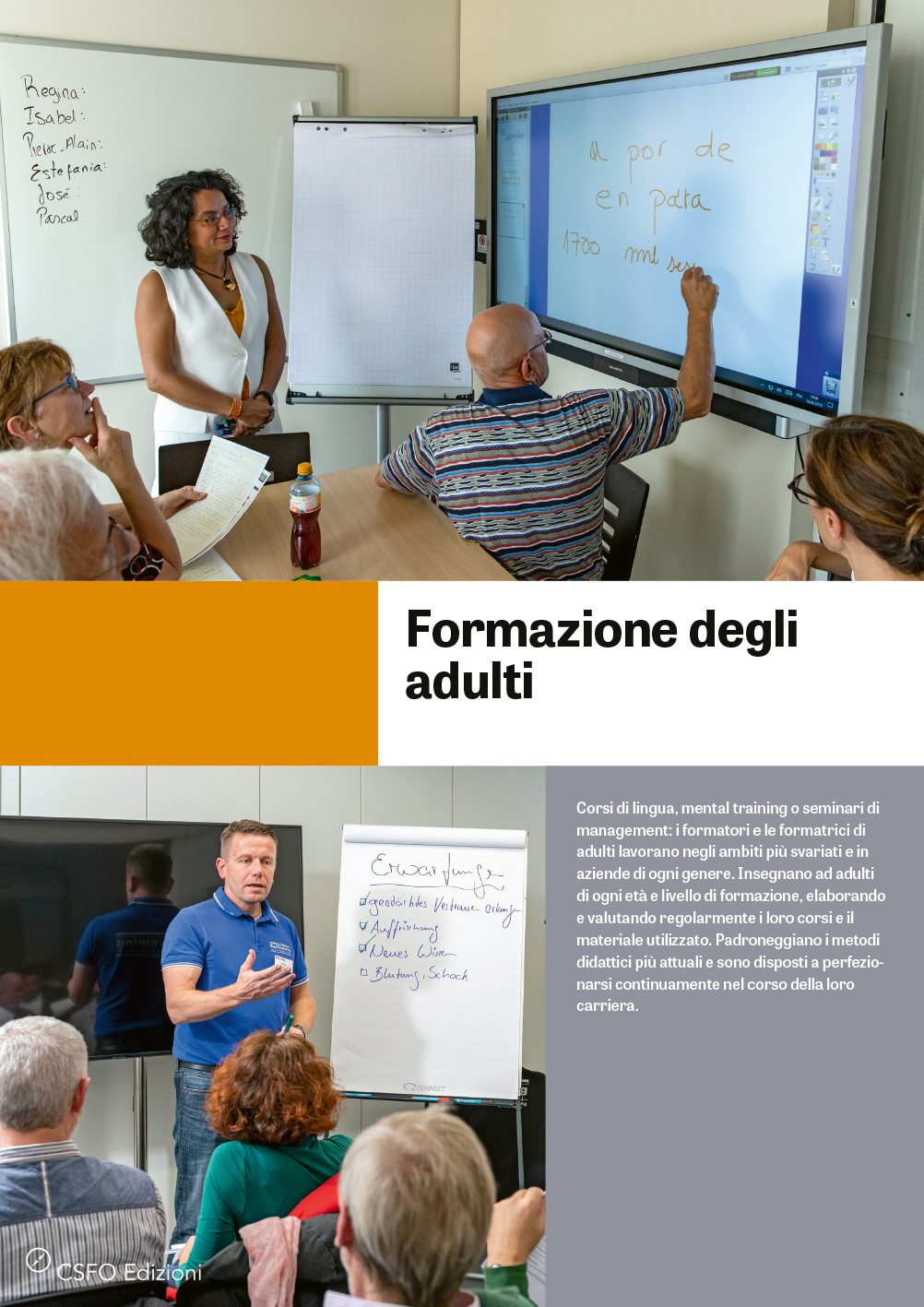Corsi di lingua, mental training o seminari di management: i formatori e le formatrici di adulti lavorano negli ambiti più svariati e in aziende di ogni genere. Insegnano ad adulti di ogni età e livello di formazione, elaborando e valutando regolarmente i loro corsi e il materiale utilizzato. Padroneggiano i metodi didattici più attuali e sono disposti a perfezionarsi continuamente nel corso della loro carriera.
