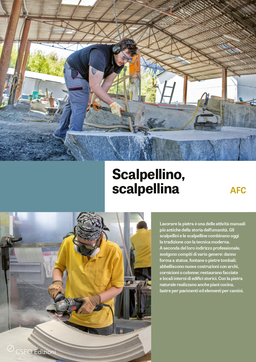Lavorare la pietra è una delle attività manuali più antiche della storia dell’umanità. Gli scalpellini e le scalpelline combinano oggi la tradizione con la tecnica moderna. A seconda del loro indirizzo professionale, svolgono compiti di vario genere: danno forma a statue, fontane o pietre tombali; abbelliscono nuove costruzioni con archi, cornicioni o colonne; restaurano facciate e locali interni di edifici storici. Con la pietra naturale realizzano anche piani cucina, lastre per pavimenti ed elementi per camini.