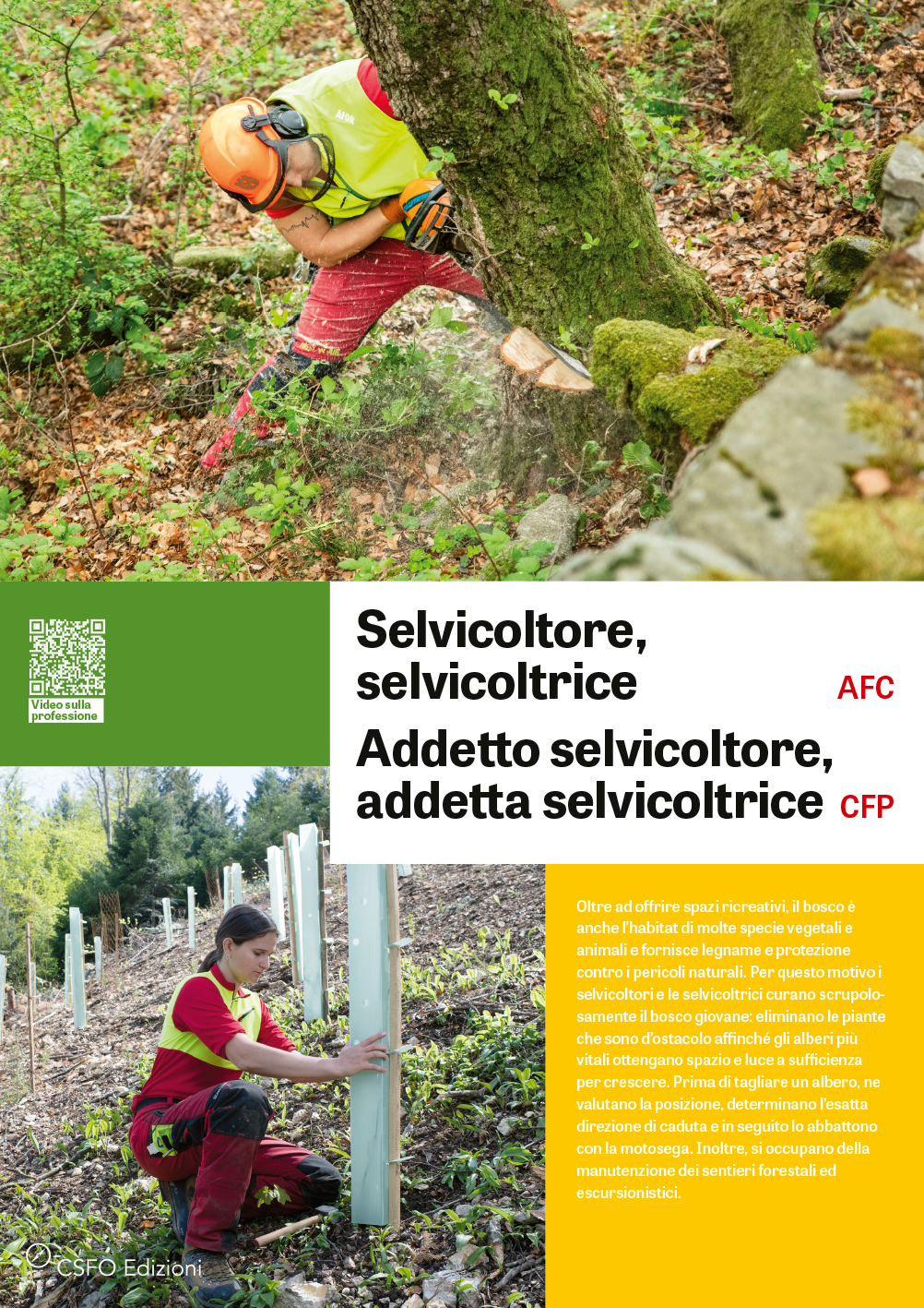 Oltre ad offrire spazi ricreativi, il bosco è anche l’habitat di molte specie vegetali e animali e fornisce legname e protezione contro i pericoli naturali. Per questo motivo i selvicoltori e le selvicoltrici curano scrupolosamente il bosco giovane: eliminano le piante che sono d’ostacolo affinché gli alberi più vitali ottengano spazio e luce a sufficienza per crescere. Prima di tagliare un albero, ne valutano la posizione, determinano l’esatta direzione di caduta e in seguito lo abbattono con la motosega. Inoltre, si occupano della manutenzione dei sentieri forestali ed escursionistici.
