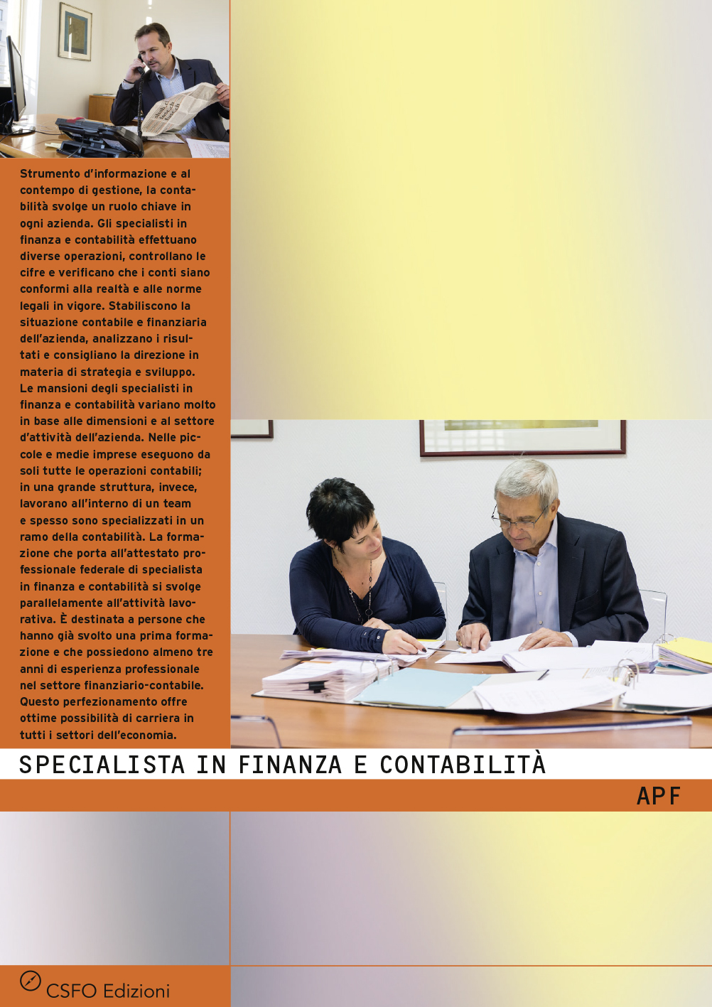 Strumento d'informazione e al contempo di gestione, la contabilità svolge un ruolo chiave in ogni azienda. Gli specialisti in finanza e contabilità effettuano diverse operazioni, controllano le cifre e verificano che i conti siano conformi alla realtà e alle norme legali in vigore. Stabiliscono la situazione contabile e finanziaria dell'azienda, analizzano i risultati e consigliano la direzione in materia di strategia e sviluppo. Le mansioni degli specialisti in finanza e contabilità variano molto in base alle dimensioni e al settore d'attività dell'azienda. Nelle piccole e medie imprese eseguono da soli tutte le operazioni contabili; in una grande struttura, invece, lavorano all'interno di un team e spesso sono specializzati in un ramo della contabilità. La formazione che porta all'attestato professionale federale di specialista in finanza e contabilità si svolge parallelamente all'attività lavorativa. È destinata a persone che hanno già svolto una prima formazione e che possiedono almeno tre anni di esperienza professionale nel settore finanziario-contabile. Questo perfezionamento offre ottime possibilità di carriera in tutti i settori dell'economia.