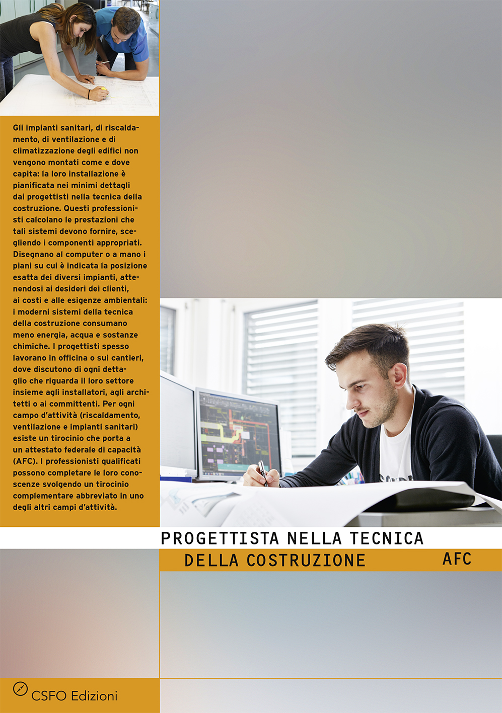Disegnano al computer o a mano i piani su cui è indicata la posizione esatta dei diversi impianti, attenendosi ai desideri dei clienti, ai costi e alle esigenze ambientali: i moderni sistemi della tecnica della costruzione consumano meno energia, acqua e sostanze chimiche. I progettisti spesso lavorano in officina o sui cantieri, dove discutono di ogni dettaglio che riguarda il loro settore insieme agli installatori, agli architetti o ai committenti. Per ogni campo d'attività (riscaldamento, ventilazione e impianti sanitari) esiste un tirocinio che porta a un attestato federale di capacità (AFC).