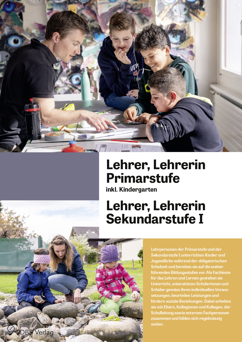 Das Faltblatt porträtiert einen Primarlehrer und zeigt, wie er mit viel Engagement und guter Organisation alle Aufgaben unter einen Hut bringt. Die junge Sekundarlehrerin schätzt die Konstanz und den vertieften Kontakt, die als Klassenlehrerin möglich sind. Die Lehrerin für Kindergarten und Unterstufe betont die Wichtigkeit von Ritualen auf ihrer Stufe. Und der Professor einer Pädagogischen Hochschule berichtet im Interview über die Entwicklungen in den letzten Jahren an der Schnittstelle Kindergarten-Unterstufe.