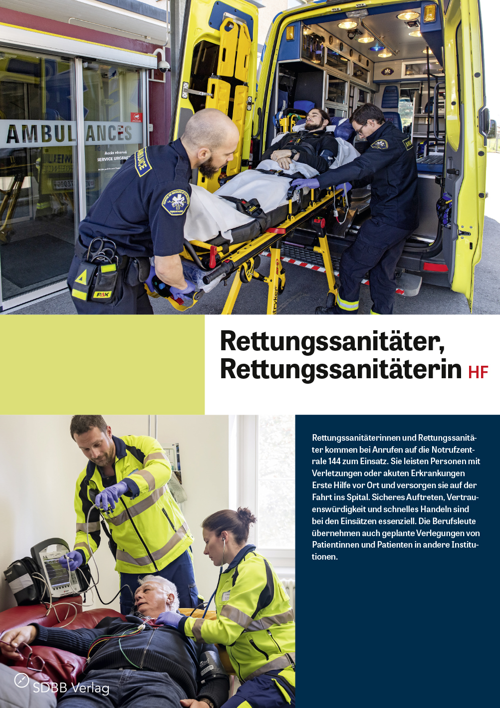 Das Faltblatt porträtiert in Wort und Bild vier Berufsleute. Die erfahrene Rettungssanitäterin in einem Kantonsspital blüht auf, wenn der Einsatz herausfordern ist. Der junge Rettungssanitäter in einer Randregion kommt sowohl im Tal wie auch im Berggebiet zum Einsatz und muss sich geografisch gut auskennen. Der Rettungssanitäter bei der Rega ist mit dem Helikopter ebenfalls im Gebirge im Einsatz. Weiter erzählt die stellvertretende Betriebsleiterin, was es denn sonst noch alles zu tun gibt, damit der Rettungsdienst rund läuft.