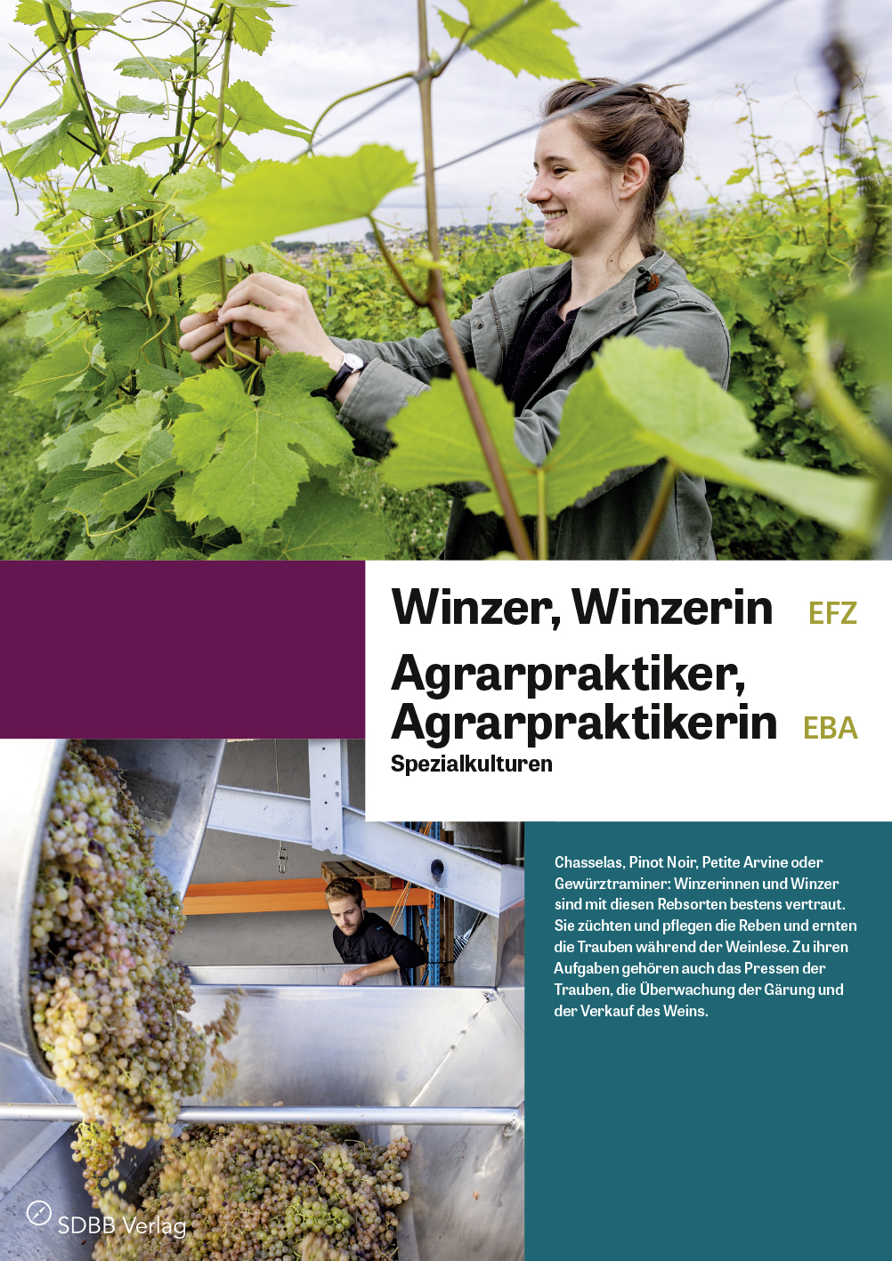 Das Faltblatt porträtiert in Wort und Bild zwei junge Berufsleute: Ein lernender Winzer steckt mitten in der arbeitsintensiven Zeit der Weinernte. Eine junge Berufsfrau berichtet von der komplexen Pflege der Reben während des Sommers. Und eine lernende Agrarpraktikerin wirft einen Blick auf Winter und Frühling, wenn die Reben geschnitten und der Boden bearbeitet wird.