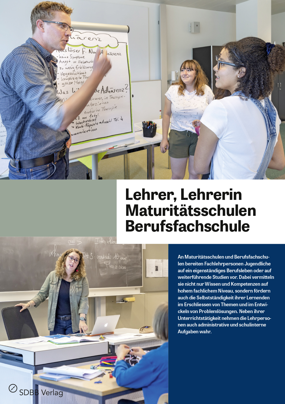 Das Faltblatt zeigt illustriert in Wort und Bild zwei Porträts von Berufsleuten: Eine junge Gymnasiallehrerin unterrichtet mit acht Klassen in Geografie und mit zwei in Geschichte insgesamt fast 200 Schüler/innen. Der Berufskundelehrer in einem Ausbildungszentrum für Gesundheitsberufe unterrichtet die lernenden Fachpersonen Gesundheit in engem Bezug zur Praxis im Lehrbetrieb. Zwei Interviews, mit einem Biologielehrer an einer Fachmitteschule und mit einer Dozentin für Fachdidaktik für allgemeinbildenden Unterricht, zeigen weitere Aspekte des Lehrerberufes.