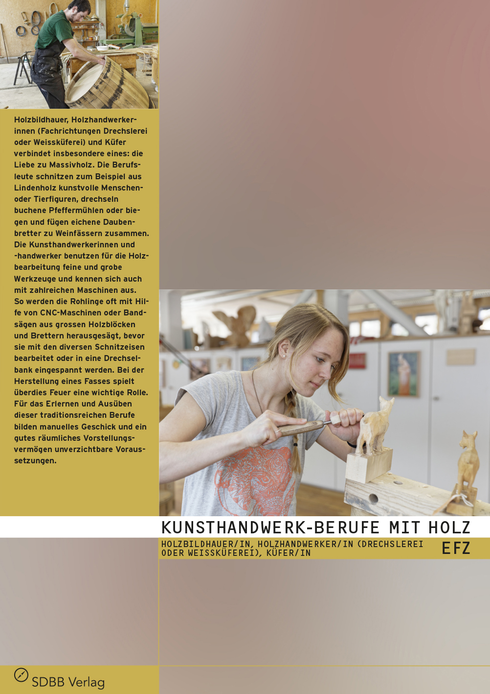 Neben den interessanten Porträts, die Einblick in die verschiedenen Arbeitswelten der Kunsthandwerker/innen geben, informiert das Faltblatt auch über die Inhalte der Grundbildungen, die Weiterbildungsmöglichkeiten, die Anforderungen und die Situation auf dem Arbeitsmarkt. Es ist mit grosszügigen Bildern illustriert.