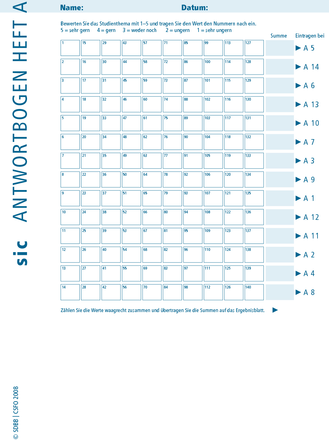 Der sic ist in neu fünf Teilbereiche A - E mit fünf Arbeitsheften zu den verschiedenen Fakultäten aufgeteilt, die unabhängig voneinander in je ca. 30 Minuten bearbeitet werden können. In der Auswertung sind die Studienrichtungen nach "Verwandtschaften" angeordnet, wodurch Interessenschwerpunkte erkennbar werden. Viele Ratsuchende werden alle fünf Hefte bearbeiten. Andere wiederum wollen vielleicht nur einen oder zwei Bereiche beurteilen. Für alle fünf Hefte gibt es einen gemeinsamen Auswertungsbogen, welcher ermöglicht, auch die weggelassenen Studienrichtungen zu überblicken. Die Auswertung zeigt das schon von der ersten Auflage bekannte Studien-Interessen-Profil.