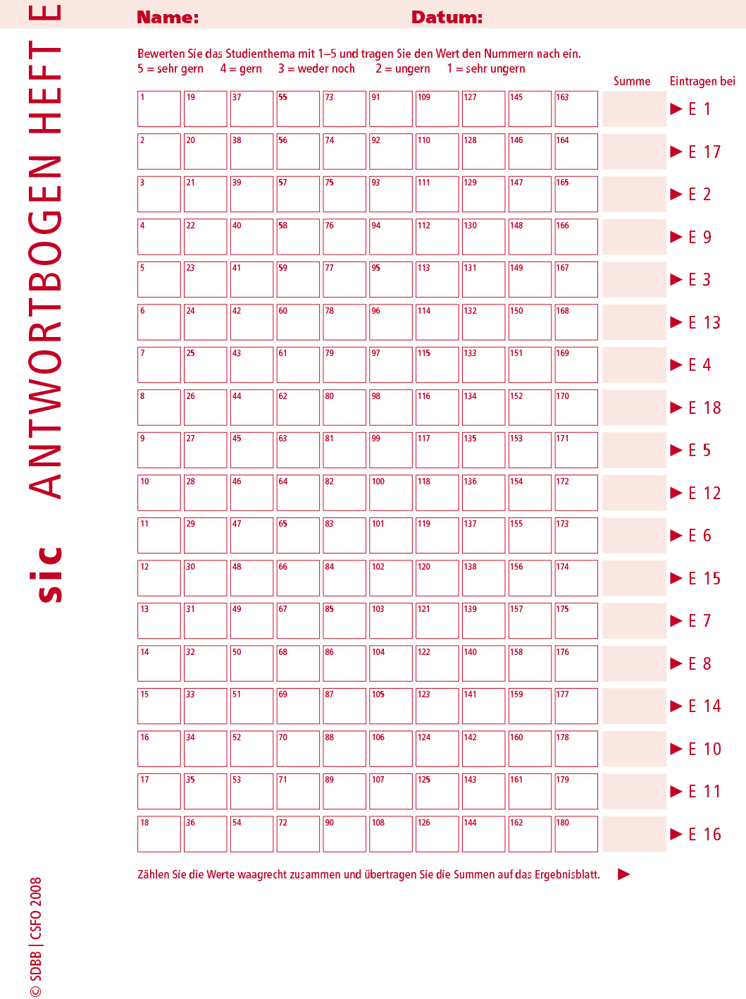 Der sic ist in neu fünf Teilbereiche A - E mit fünf Arbeitsheften zu den verschiedenen Fakultäten aufgeteilt, die unabhängig voneinander in je ca. 30 Minuten bearbeitet werden können. In der Auswertung sind die Studienrichtungen nach "Verwandtschaften" angeordnet, wodurch Interessenschwerpunkte erkennbar werden. Viele Ratsuchende werden alle fünf Hefte bearbeiten. Andere wiederum wollen vielleicht nur einen oder zwei Bereiche beurteilen. Für alle fünf Hefte gibt es einen gemeinsamen Auswertungsbogen, welcher ermöglicht, auch die weggelassenen Studienrichtungen zu überblicken. Die Auswertung zeigt das schon von der ersten Auflage bekannte Studien-Interessen-Profil.