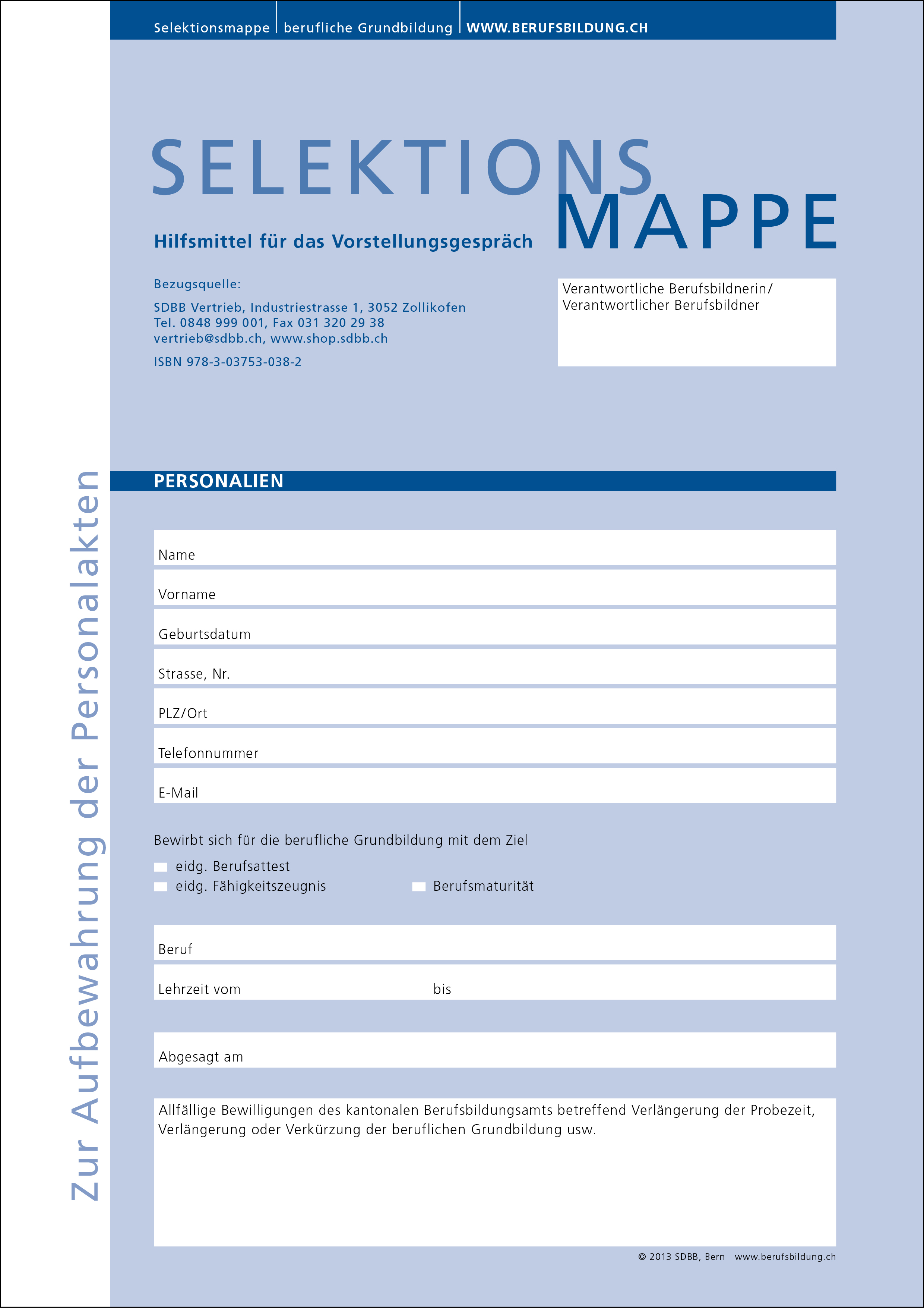 Die Selektionsmappe ist ein Hilfsmittel für die Auswahl und Einstellung von Lernenden. Der Fragebogen, ergänzt durch eine «Gebrauchsanweisung», ist so aufgebaut, dass das Vorstellungsgespräch nach einem logischen Ablauf geführt werden kann. Werden alle Bewerber/innen mit diesem Fragebogen befragt, verfügen die Berufsbildner/innen über eine systematische Grundlage, die einen objektiven Vergleich zulässt und gleichzeitig fundierte Begründungen für Zu- oder Absagen liefert. Ausserdem können die gesammelten Personalakten in dieser Mappe bequem aufbewahrt werden.